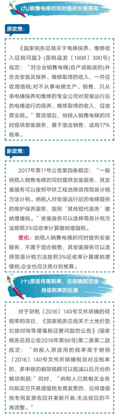 变化:纳税人销售活动板房、机器设备、钢结构件等自产货物的同时提供建筑、安装服务,分别适用17%和11%税率,不统一适用17%税率。